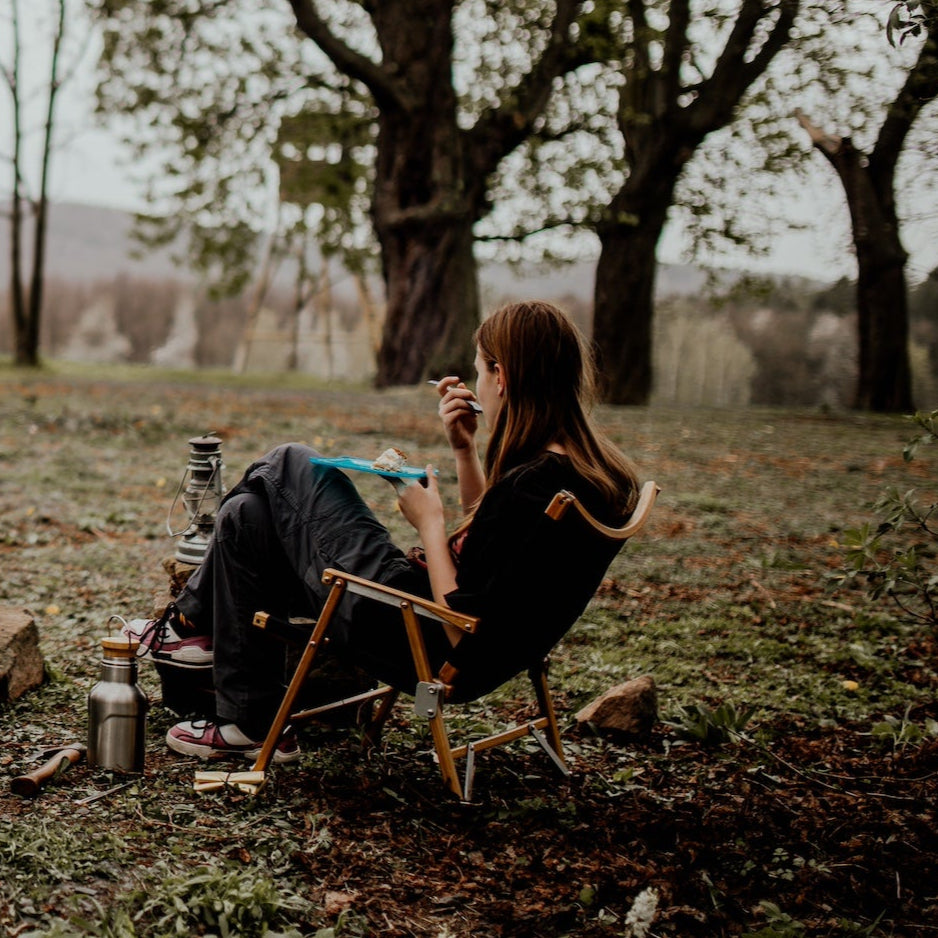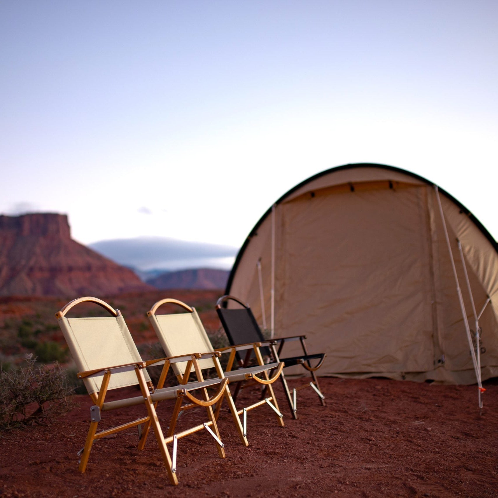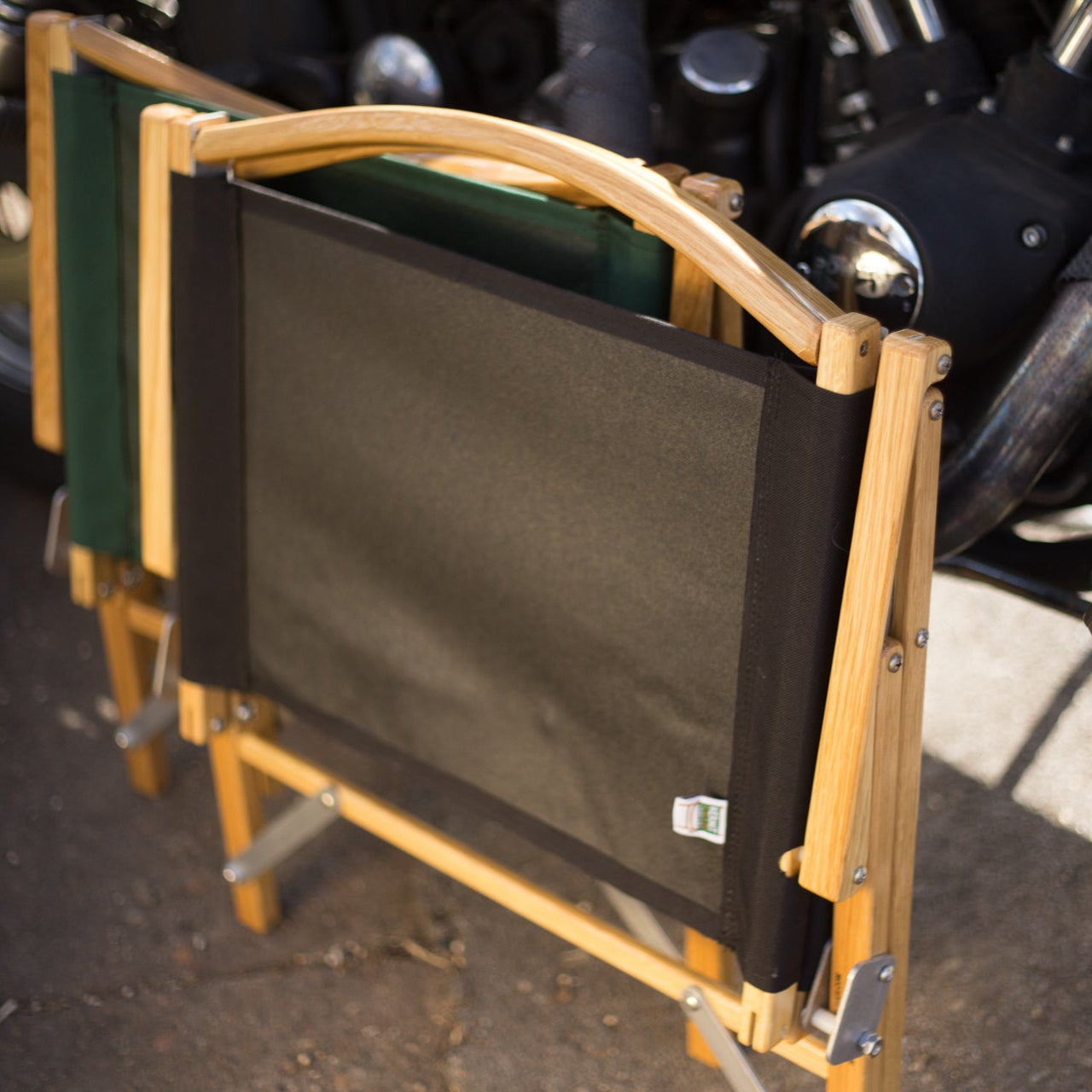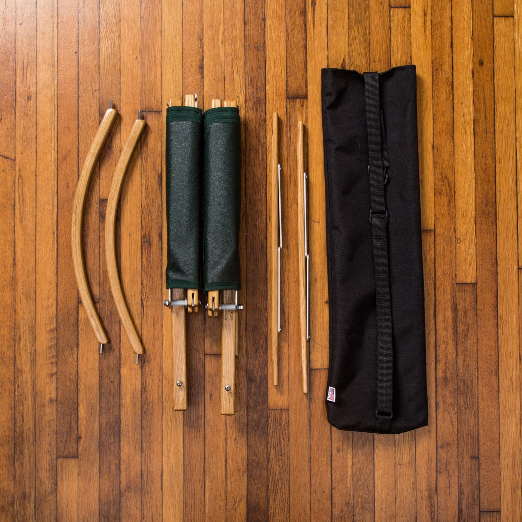 The Classic Oak Kermit Chair is the premier lightweight wooden camping chair, designed and manufactured unlike any other foldable chair on the market. The Kermit Chair is made in Tennessee from locally-sourced white oak, with aluminum and stainless steel hardware. The wood is double-dipped in satin finish polyurethane to protect it from extended outdoor usage. Our seat covers are incredibly durable 1000-denier coated nylon, cut with heat to prevent unraveling. The chair comes equipped with its own bag with a handy carrying strap.