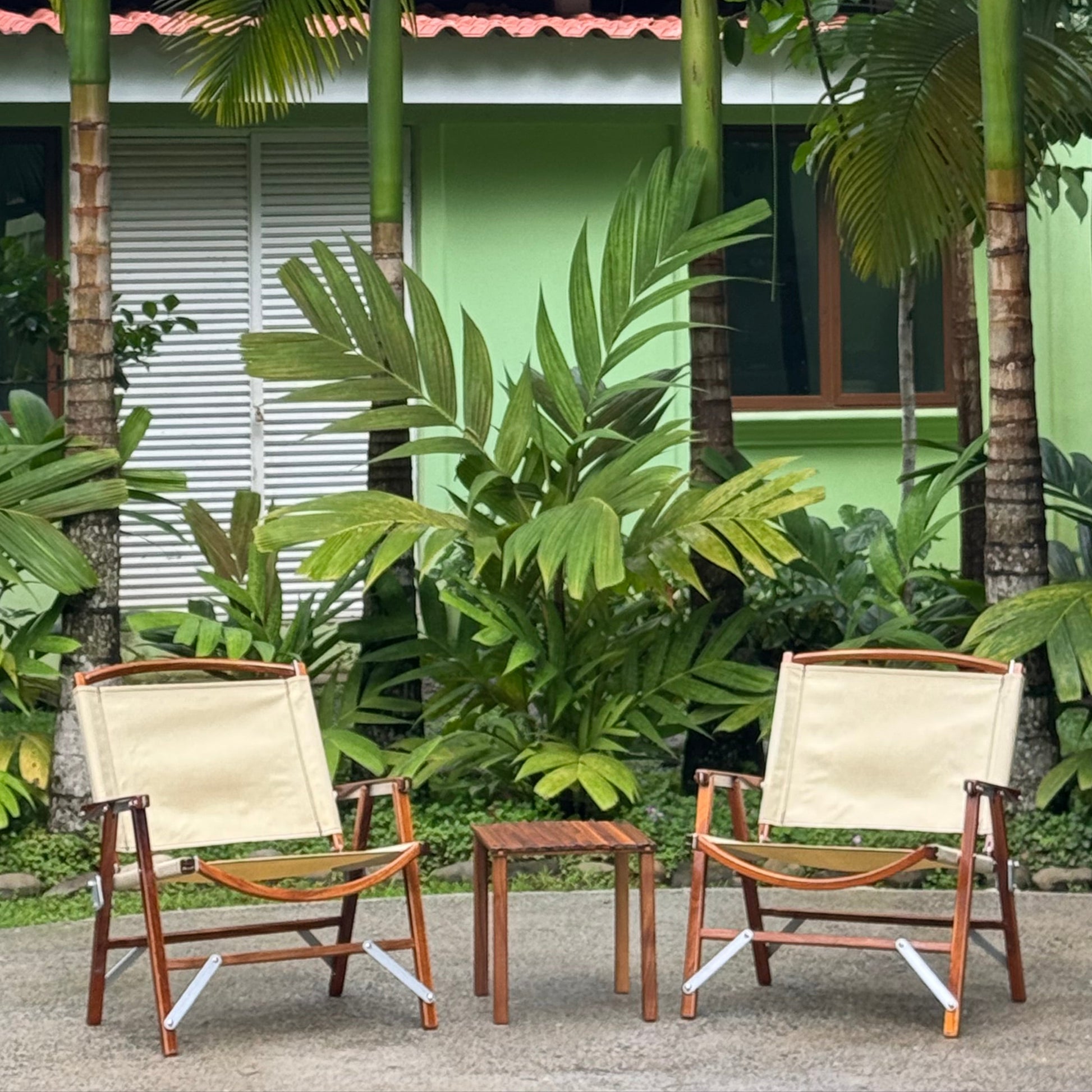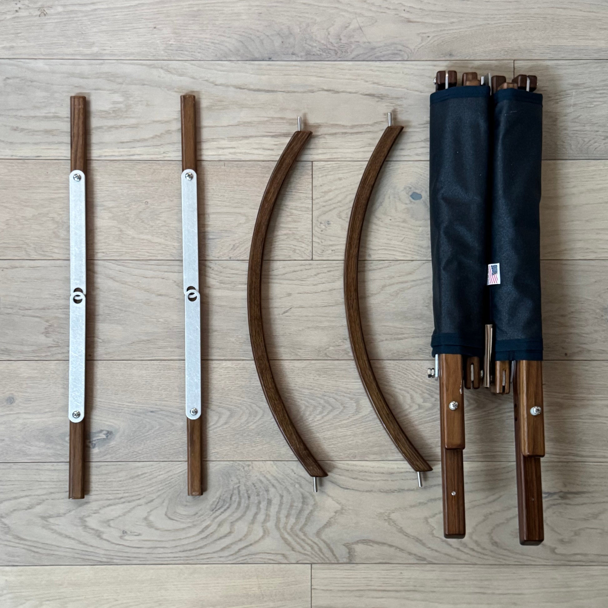 Presenting our Classic Kermit Chair in Walnut. This is the premier wooden camping chair, designed and manufactured unlike any other foldable chair on the market. The Kermit Chair is made in Tennessee from locally-sourced walnut, with aluminum and stainless steel hardware. The wood is double-dipped in satin finish polyurethane to protect it for a lifetime. Our seat covers are made with incredibly durable 1000-denier coated nylon, which we cut with heat to prevent unraveling. The chair comes equipped with its own bag with a handy carrying strap.